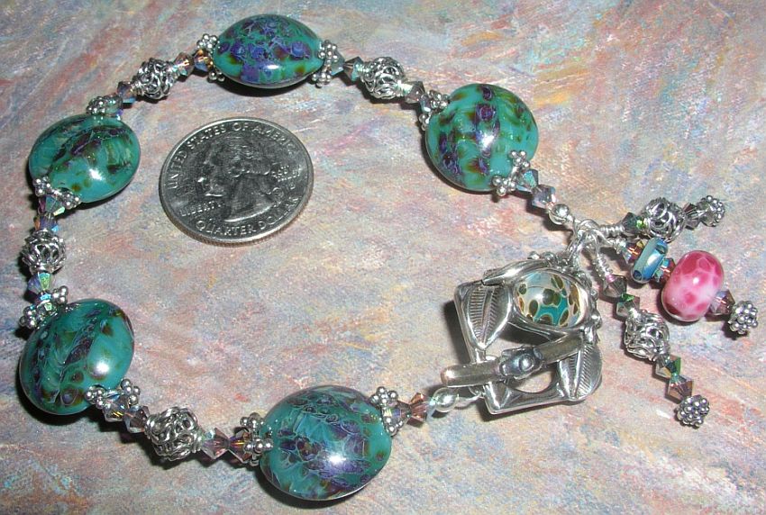 This bracelet was inspired by the picture below and was entered in the October Creativity Challenge contest that The Mellow Bead holds each month. However, it is MUCH prettier than the photo that inspired it!!! Lots of lacy sterling beads and bead caps are used to show off the lampwork beads and gorgeous Swarovski crystal provides much sparkle and flare! The beautiful toggle finishes this piece off, making it a keepsake you will treasure for life.
