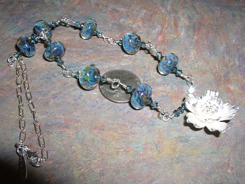 This necklace is simply gorgeous! The lampwork beads are outstanding, filled with beautiful color and the sterling silver floral focal makes this a piece you will wear with pride.