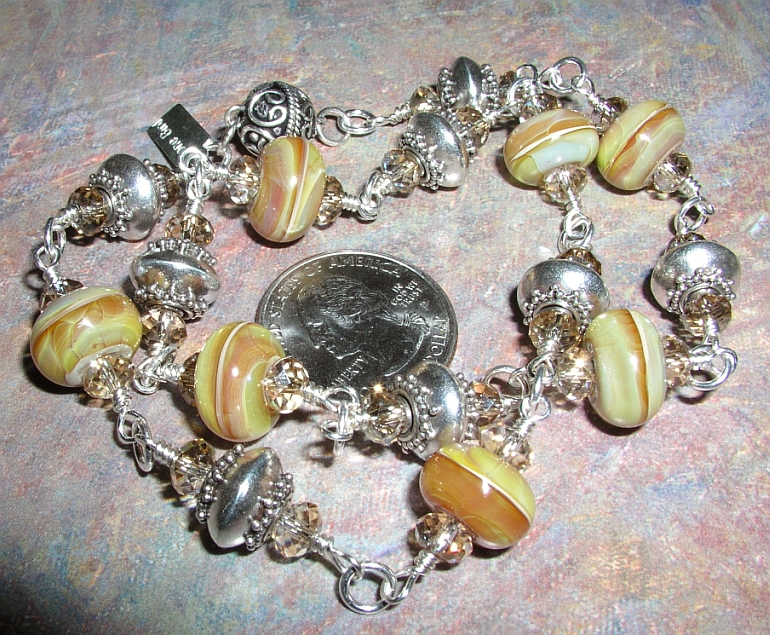 Beautiful butterscotch colored lampworked beads give this necklace a happy, upbeat feel! Accented with silver beads and rich Swarovski crystal. It has a magnetic clasp and can be wrapped around twice and worn as a bracelet if you desire!